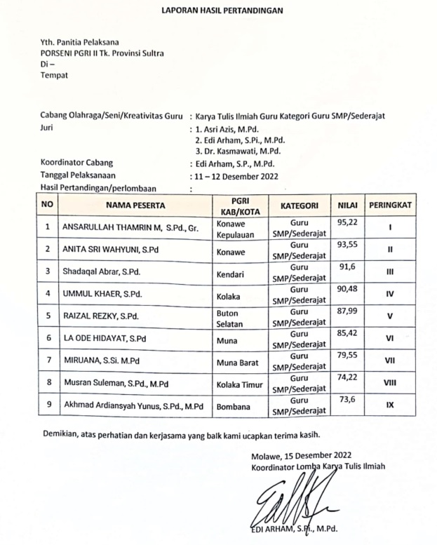 Guru SMP Negeri 2 Wawonii Utara, Kabupaten Konawe Kepulauan, Ansarullah Thamrin Mardhan, S.Pd, Gr. berhasil meraih Juara 1 Lomba Karya Tulis Ilmiah Kategori SMP pada Peringatan Hari Guru (HGN) dan Porseni HUT PGRI ke-77 Tingkat Provinsi Sulawesi Tenggara yang dilaksanakan di Konawe Utara. Ansarullah mewakili Kabupaten Konawe Kepulauan dan berhasil meraih juara 1 setelah memperoleh nilai tertinggi 95,22 diatas peserta yang berasal dari 8 Kabupaten lainnya. Adapun jenis Karya Tulis Ilmiah (KTI) yang dibuat adalah Best Practice dengan judul “Pembuatan Aplikasi CBT Offline untuk Pelaksanaan Ujian Berbasis TIK dalam Rangka Meningkatkan Kemampuan Literasi Digital Guru dan Peserta Didik SMP Negeri 2 Wawonii Utara”. Aplikasi ujian CBT Offline di SMP Negeri 2 Wawonii Utara telah digunakan sejak tahun 2019 hingga saat ini. Aplikasi Ujian CBT Offline di SMP Negeri 2 Wawonii Utara dapat berkembang dan terlaksana berkat dukungan kepala sekolah, kerjasama yang baik serta dukungan rekan-rekan guru hebat yang selalu siap menyelenggarkan ujian berbasis TIK meskipun dalam berbagai macam keterbatasan. Ini menjadi salah satu pengalaman terbaik sehingga dituangkan dalam bentuk Karya Tulis Ilmiah. Sebelumnya, Ansarullah juga menjadi salah satu guru yang mendapatkan penghargaan Guru Berprestasi dan Berdedikasi Tingkat Provinsi Sulawesi Tenggara yang diberikan pada Peringatan HGN dan Porseni HUT PGRI ke-77 Se-Sulawesi Tenggara yang dilaksanakan di Konawe Utara. “Prestasi yang diraih salah satu guru kami menjadi bukti bahwa guru di Kabupaten Konawe Kepulauan mempunyai motivasi dan daya saing yang kuat. Dengan kerjasama yang baik, motivasi yang kuat serta saling mendukung, yakin kedepannya akan semakin banyak prestasi yang mampu ditorehkan oleh guru-guru hebat di Kabupaten Konawe Kepulauan.” Ujar Asriadi Selaku Kepala SMPN 2 Wawonii Utara. (atm)