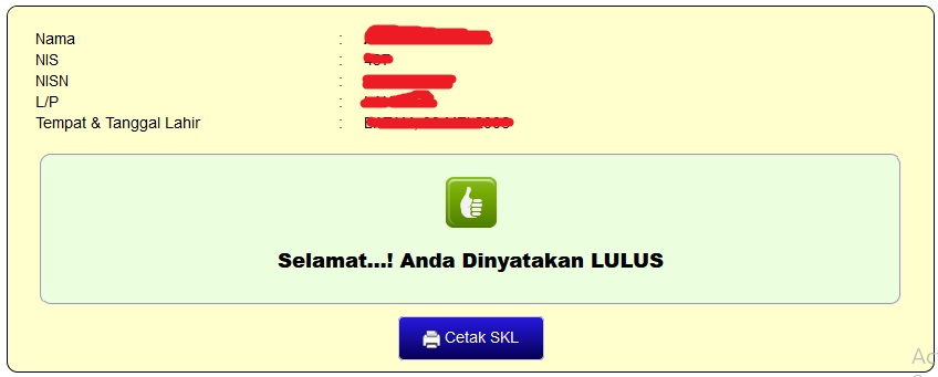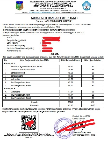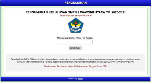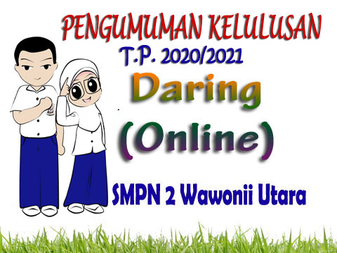 Berdasarkan hasil rapat Penentuan Kelulusan T.P. 2020/2021 pada tanggal 03 Juni 2021, salah satunya diputuskan bahwa pengumuman kelulusan SMPN 2 Wawonii Utara dilakukan secara daring (online). Untuk mengakses pengumuman kelulusan daring T.P. 2020/2021, ikuti langkah-langkah sebagai berikut : 1. Kunjungi http://www.smpn2wawoniiutara.sch.id/pengumuman .Pengumuman akan dirilis/diaktifkan pada tanggal 04 Juni 2021 mulai pukul 10.00 WITA. 2. Ketikkan nomor NISN (10 angka) pada kotak yang disediakan. Daftar nomor NISN dapat dilihat pada website sekolah http://www.smpn2wawoniiutara.sch.id pada menu DIREKTORI, DIREKTORI SISWA. 3. Klik LIHAT HASIL, Selanjutnya hasil akan ditampilkan LULUS atau TIDAK LULUS. 4. Untuk melihat/mencetak SKL, selanjutnya klik CETAK SKL. SKL yang dihasilkan masing-masing mempunyai QR Code sebagai validasi. (atm)