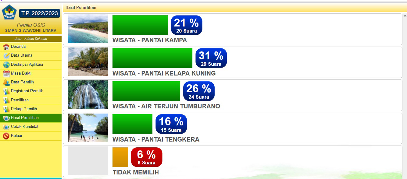Kamis, 29 September 2022, SMP Negeri 2 Wawonii Utara sukses menggelar SIMULASI pelaksanaan pemilihan Ketua dan Wakil Ketua OSIS masa bakti 2022/2023 berbasis IT. Simulasi ini dilaksanakan sebagai salah satu tahapan atau langkah dalam Proyek Penguatan Profil Pelajar Pancasila (P5) Kurikulum merdeka dengan tema suara demokrasi di SMP negeri 2 Wawonii Utara. “Pelaksanaan pemilihan ketua dan wakil ketua OSIS tahun ini memang berbeda dari tahun-tahun sebelumnya karena dilaksanakan menggunakan aplikasi dengan basis data elektronik. Ide penggunaan aplikasi timbul karena melihat pesatnya inovasi penggunaan IT dalam mempermudah berbagai hal. Aplikasi ini dibuat dan dikembangkan secara mandiri oleh SMP Negeri 2 Wawonii Utara sebagai inovasi untuk pelaksanaan proyek P5 Kurikulum Merdeka untuk tema Suara Demokrasi.” Ujar Ahlum Nazar, S.Pd selaku pembina proyek P5 Suara Demokrasi. Registrasi Pemilih dengan cara menscan barcode kartu peserta didik Dalam proyek P5 ini, peserta didik SMP Negeri 2 Wawonii Utara terlibat secara aktif baik sebagai pasangan calon, panitia, maupun sebagai partisipan yang berhak menggunakan suaranya untuk memilih pasangan calon yang diyakini mampu mengemban amanah sebagai ketua dan wakil ketua OSIS masa bakti 2022/2023. Peserta didik diharapkan dapat melaksanakan tugasnya secara mandiri, mengutamakan prinsip gotong royong, menetapkan pilihan tanpa memandang SARA, berpikir kritis dalam menyelesaikan permasalahan yang timbul, serta kreatif dan inovatif yang telah ditunjukkan dengan melaksanakan pemilu OSIS berbasis IT. Peserta didik memilih dengan cara menscan barcode kartu peserta didik, kemudian scan barcode kandidat yang dipilih Asriadi Hambali, S.Pd selaku kepala sekolah mengatakan bahwa suksesnya pelaksanaan simulasi ini, memantapkan persiapan pemilihan ketua dan wakil ketua OSIS SMP Negeri 2 Wawonii Utara yang InsyaAllah akan digelar pekan depan. Pengumuman hasil simulasi Tampilan aplikasi pemilu OSIS SMPN 2 Wawonii Utara, untuk simulasi peserta didik memilih tempat wisata yang paling diminati di kabupaten Konawe Kepulauan (atm)