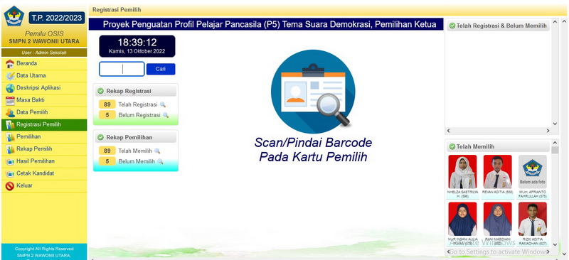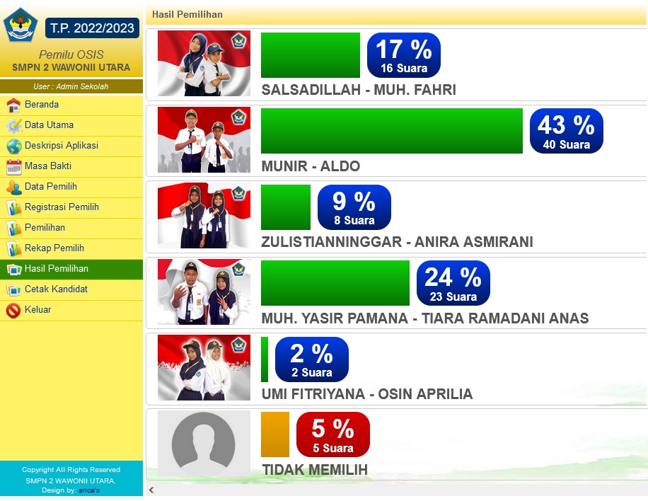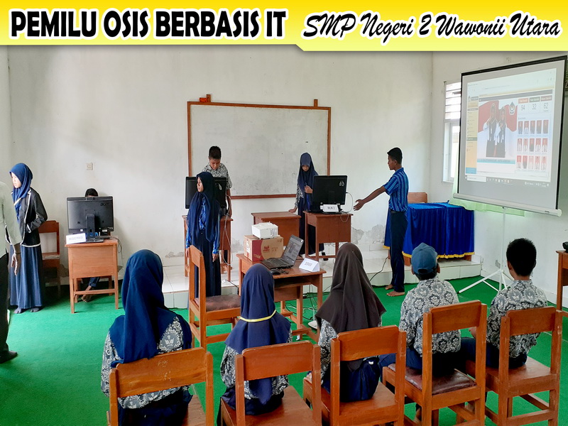 Rabu, 12 Oktober 2022, SMP Negeri 2 Wawonii Utara menggelar pelaksanaan pemilihan Ketua dan Wakil Ketua OSIS masa bakti 2022/2023 berbasis IT. Kegiatan pemilihan ketua dan wakil ketua OSIS SMP Negeri 2 Wawonii Utara menjadi salah satu Proyek Penguatan Profil Pelajar Pancasila (P5) Kurikulum merdeka untuk tema SUARA DEMOKRASI. Pelaksanaan pemilu OSIS tahun ini berbeda dengan tahun-tahun sebelumnya karena dilaksanakan dengan memanfaatkan peralatan IT berupa 2 buah PC ALL In One, 1 buah laptop, 1 buah LCD dengan alat input 3 buah Barcode Scanner. Ide dan pembuatan Aplikasi Pemilu OSIS ini murni dikerjakan dan dikembangkan sendiri oleh SMP Negeri 2 Wawonii Utara. Foto bersama panitia pelaksana Pemilu OSIS, Guru dan Kepala Sekolah "Dengan aplikasi Pemilu OSIS, data pemilih dan hasil pemilihan terdokumentasi secara elektronik, jumlah pemilih dan yang belum memilih dapat ditampilkan secara real time, hasil pemilihan langsung dapat dilihat tepat setelah pemilihan usai sehingga kecurangan secara otomatis dapat diantisipasi. Kegiatan ini juga dapat memberikan gambaran kepada peserta didik tentang bagaimana kegiatan pemilihan yang akan dilaksanakan di masa-masa yang akan datang." Ujar Asriadi hambali sekalu Kepala Sekolah. Kandidat Calon Ketua dan Wakil Ketua OSIS Kegiatan pemilu OSIS berbasis TIK ini sepenuhnya dilaksanakan oleh peserta didik. Peserta didik SMP Negeri 2 Wawonii Utara terlibat secara aktif baik sebagai pasangan calon, panitia, maupun sebagai partisipan yang berhak menggunakan suaranya untuk memilih pasangan calon yang diyakini mampu mengemban amanah sebagai ketua dan wakil ketua OSIS masa bakti 2022/2023. Melalui Pelaksanaan Pemilu OSIS Berbasis TIK ini, Peserta didik diharapkan dapat melaksanakan tugasnya secara mandiri, mengutamakan prinsip gotong royong, menetapkan pilihan tanpa memandang SARA, berpikir kritis dalam menyelesaikan permasalahan yang timbul, serta kreatif dan inovatif yang telah ditunjukkan dengan melaksanakan pemilu OSIS berbasis IT. Panitia depan ruang pelaksanaan Pemilu OSIS Registrasi Pemilih dengan cara panitia menscan kartu peserta didik (kartu pemilih) menggunakan Barcode Scanner Ruang Tunggu Pemilih Bilik Pemilih, Peserta didik menscan kartu pemilih (kartu siswa) dan kandidat pilihan menggunakan Barcode Scanner Jumlah peserta didik SMP Negeri 2 Wawonii Utara sebagai pemilih terdaftar sebanyak 94 orang. Saat pelaksanaan pemilihan, 89 peserta didik menggunakan hak suaranya sedangkan 5 lainnya tidak menggunakan hak suara karena berhalangan hadir. Berikut screenshot hasil Pemilu OSIS SMPN 2 Wawonii Utara masa Bakti 2022-2023 : Hasil Pemilihan Ketua dan Wakil Ketua OSIS Masa Bakti 2022-2023 Suksesnya kegiatan pemilihan OSIS SMPN 2 Wawonii Utara berbasis TIK ini, semakin menambah jumlah inovasi IT yang telah dilakukan SMP Negeri 2 Wawonii Utara. Tampilan Aplikasi Pemilu OSIS SMP Negeri 2 Wawonii Utara (atm)